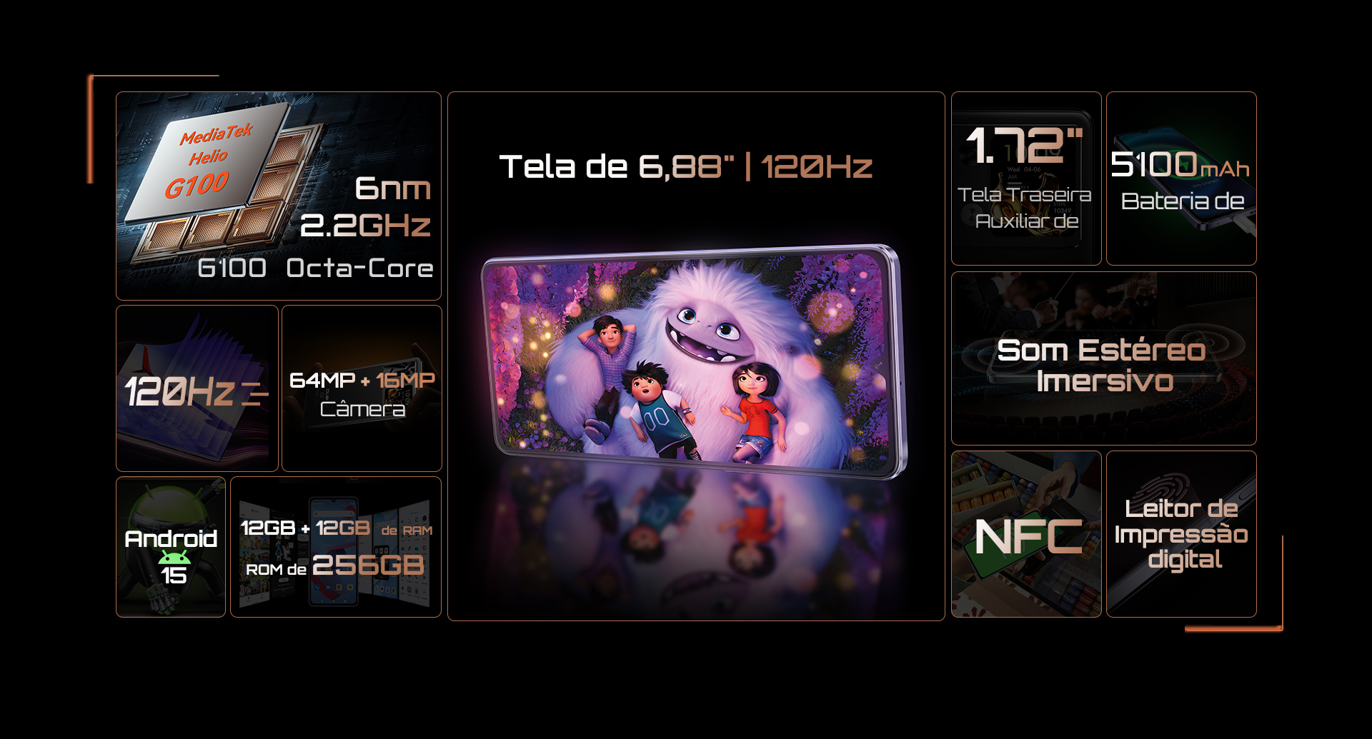 Equipado com o processador octa-core MediaTek MT6789 (G100) com arquitetura avançada de 6nm, oferece desempenho eficiente para jogos, streaming e multitarefas. Com até 2,2GHz, o lag ficou no passado.
