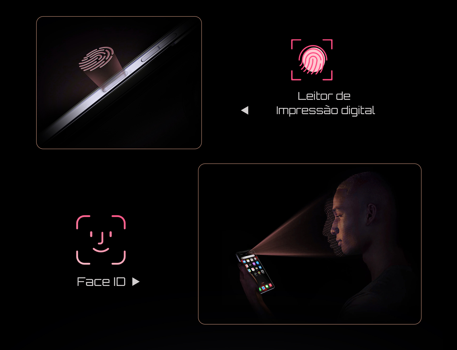Esqueça senhas — desbloqueie em um instante com reconhecimento facial ou com o leitor de digitais na lateral do aparelho. Rápido, fluido e seguro.